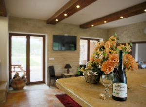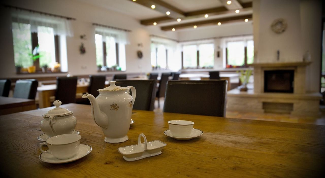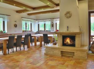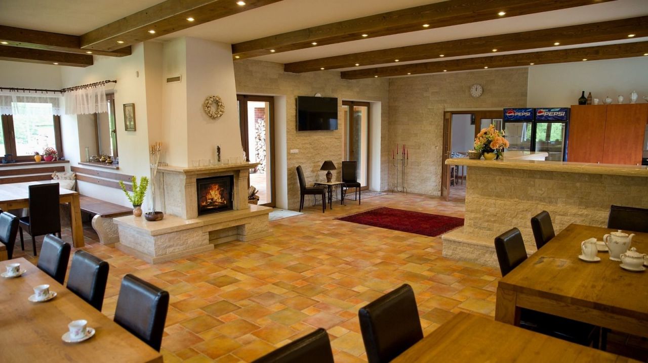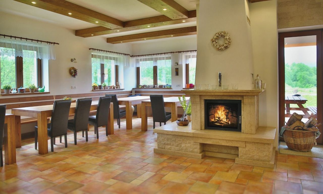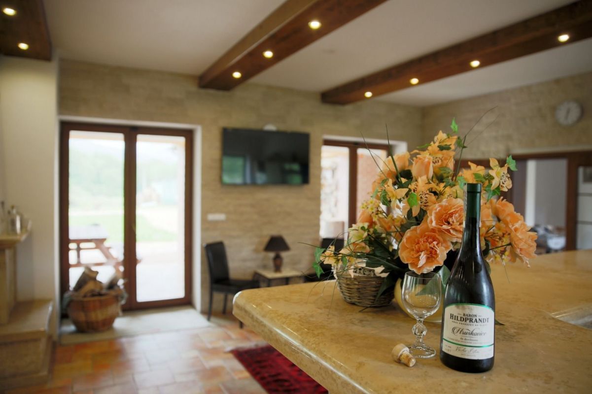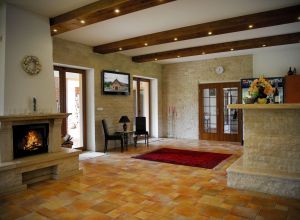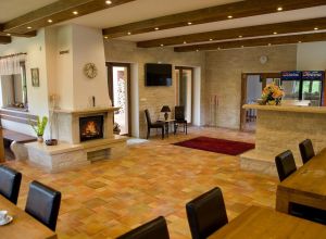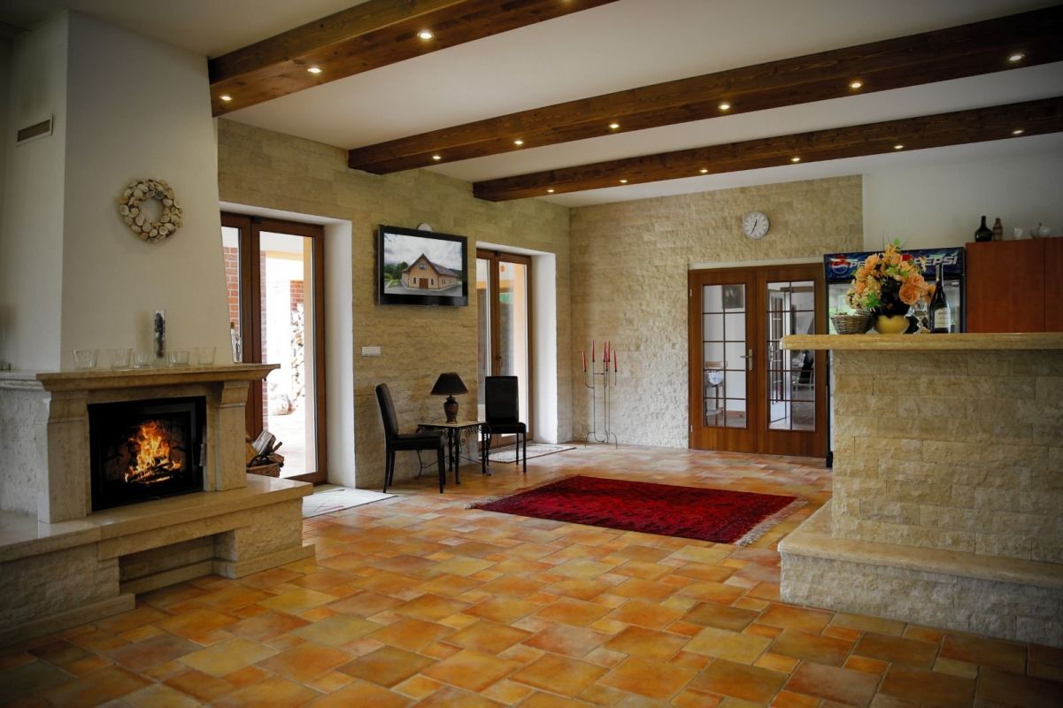 V přízemí se nachází společenská místnost s barem, krbem a televizí, na kterou navazuje zastřešená terasa poskytující příjemné posezení.